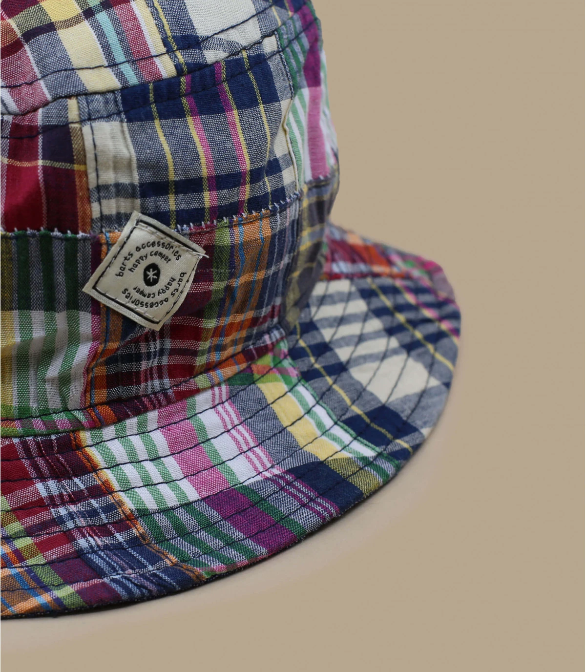 Bob Barts pour enfant. Imprimé à carreaux multicolore. Patch Barts cousu à l’avant. Il est possible d’attacher le bob autour du cou grâce aux cordons de chaque côté. Bob bénéficiant d’une protection UV 50+.