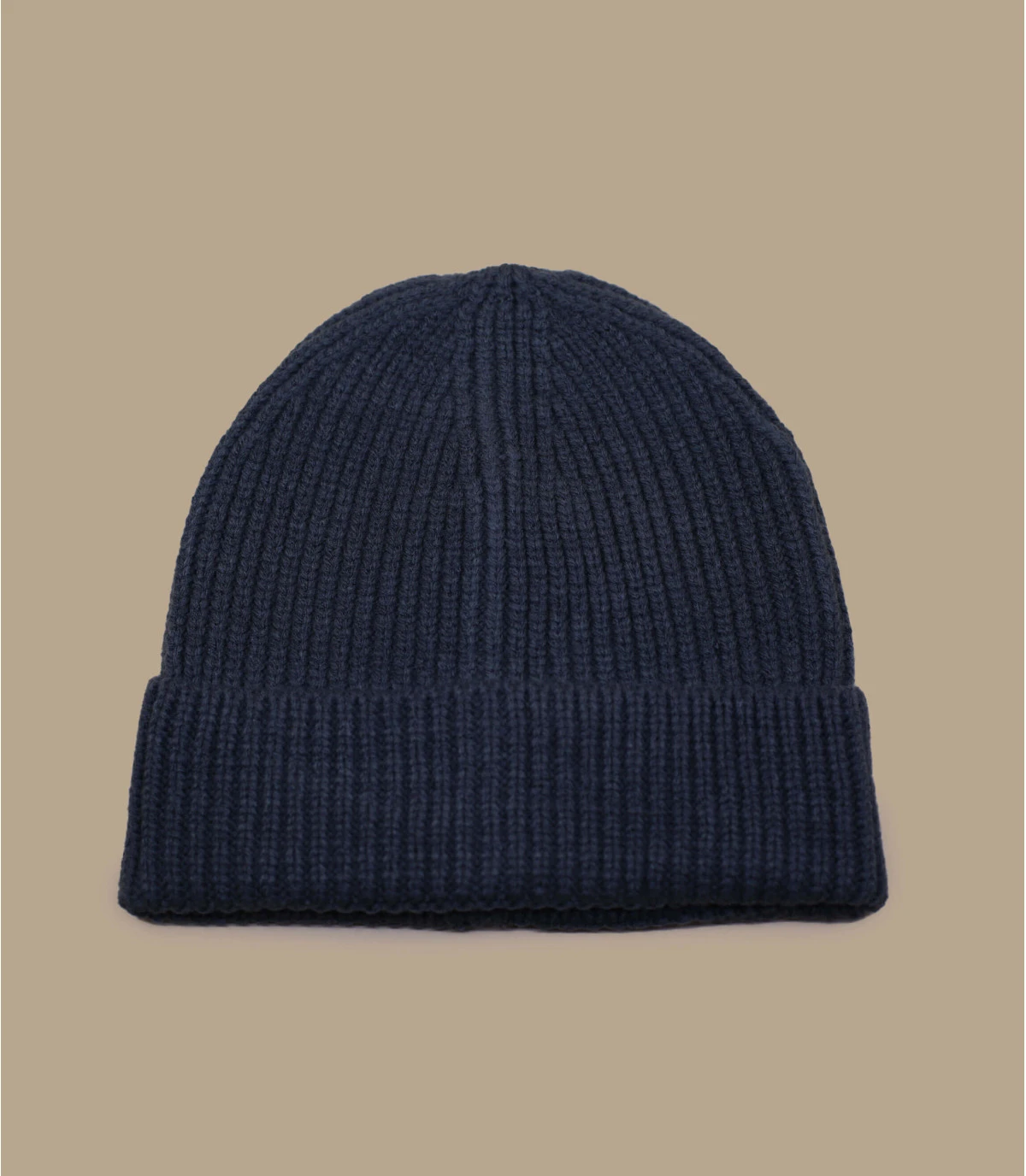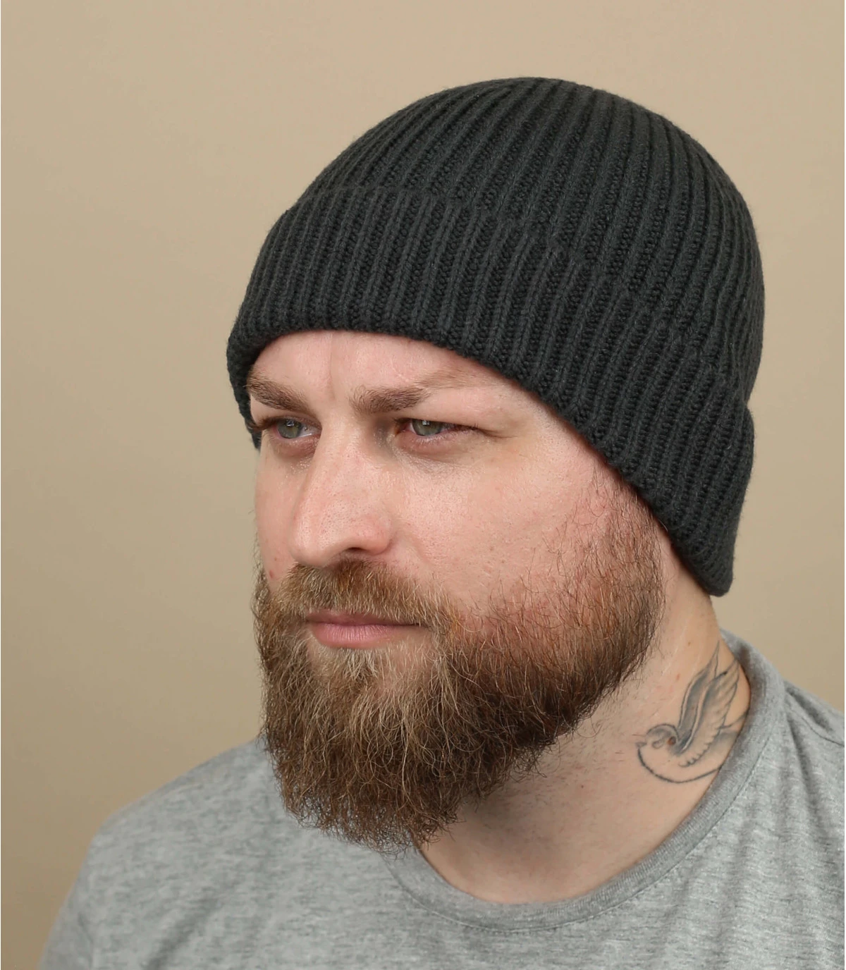 Bonnet revers en maille acrylique de couleur gris foncé. Taille unique : 55-60 cm de tour de tête.