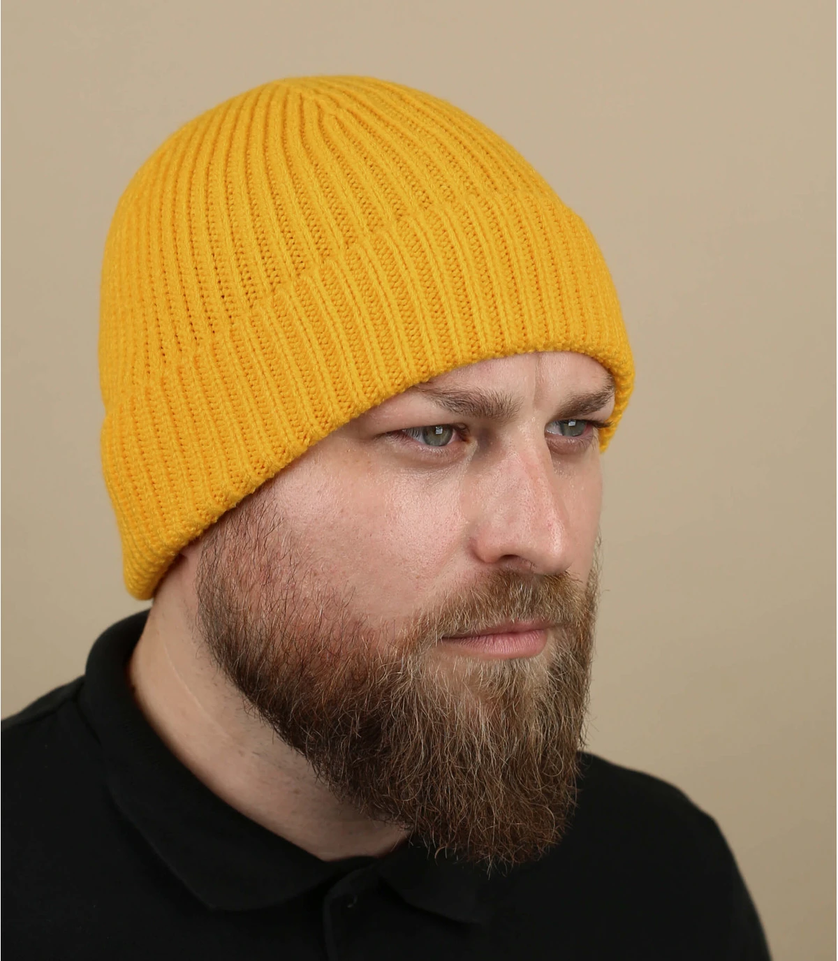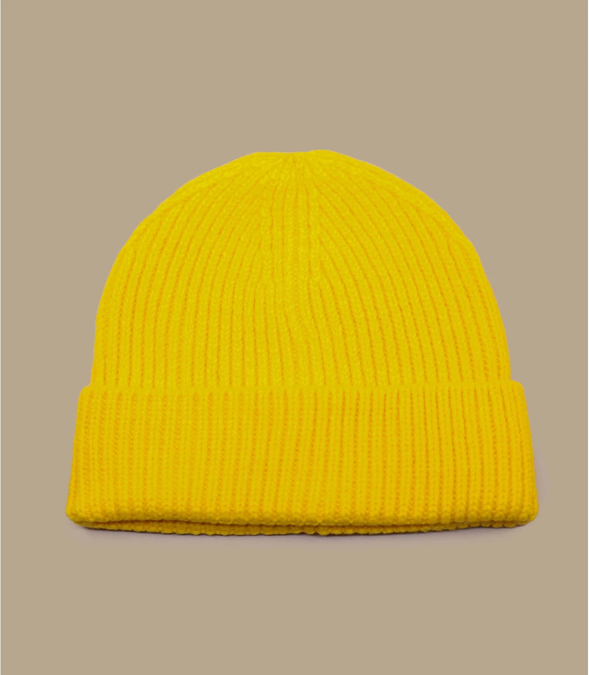 Bonnet revers en maille acrylique de couleur jaune. Taille unique : 55-60 cm de tour de tête.