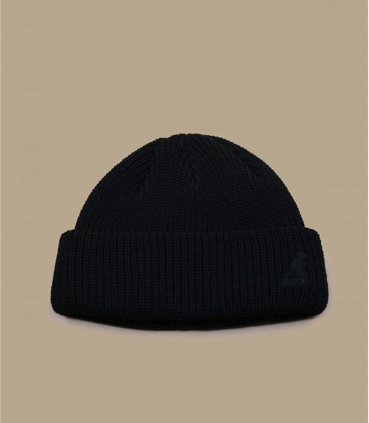 Cet astucieux bonnet noir de la marque emblématique Kangol peut se porter de deux manières différentes : avec un large revers, en mode docker, ou déplié en version bonnet long. Le logo est visible dans les deux cas.