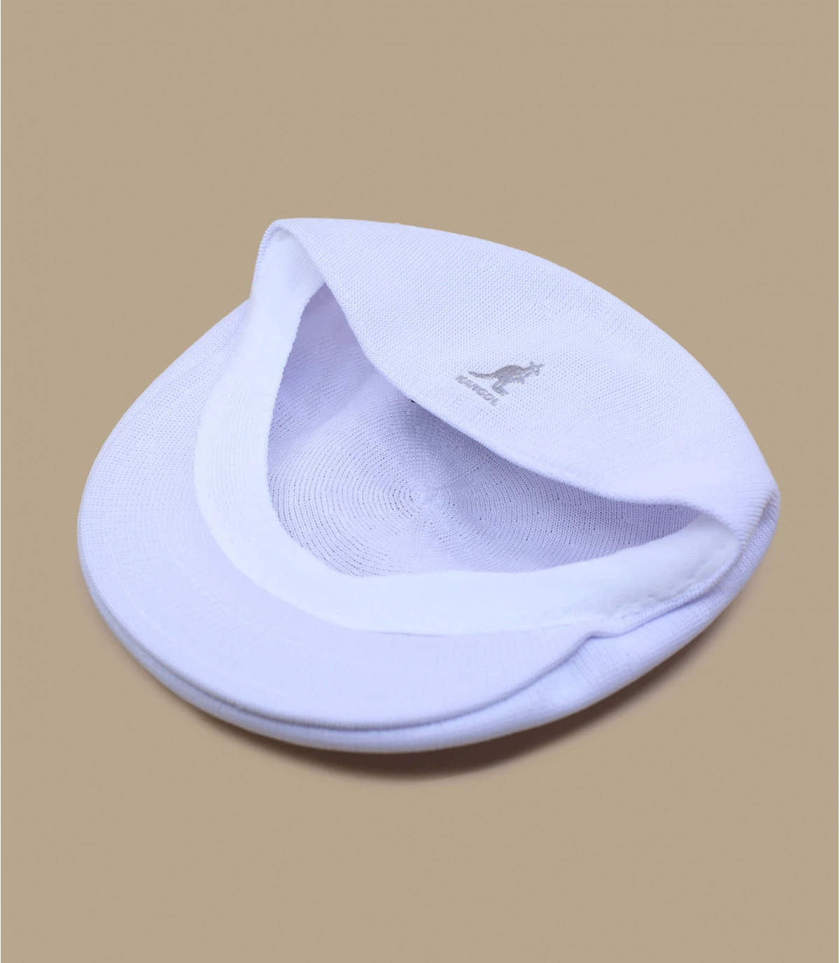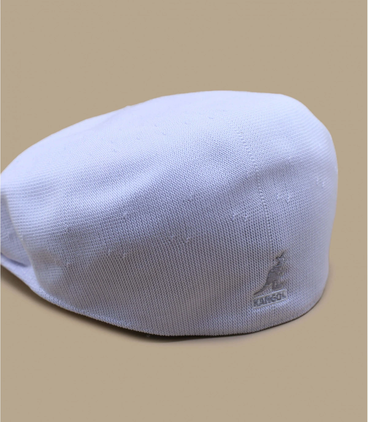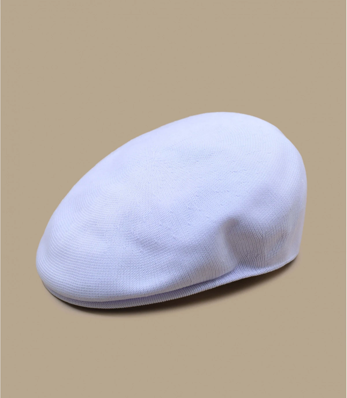 Béret casquette blanc avec visière. Logo Kangol cousu à l’arrière. 60% polyester, 40% acrylique. Bande antisueur 100% nylon.