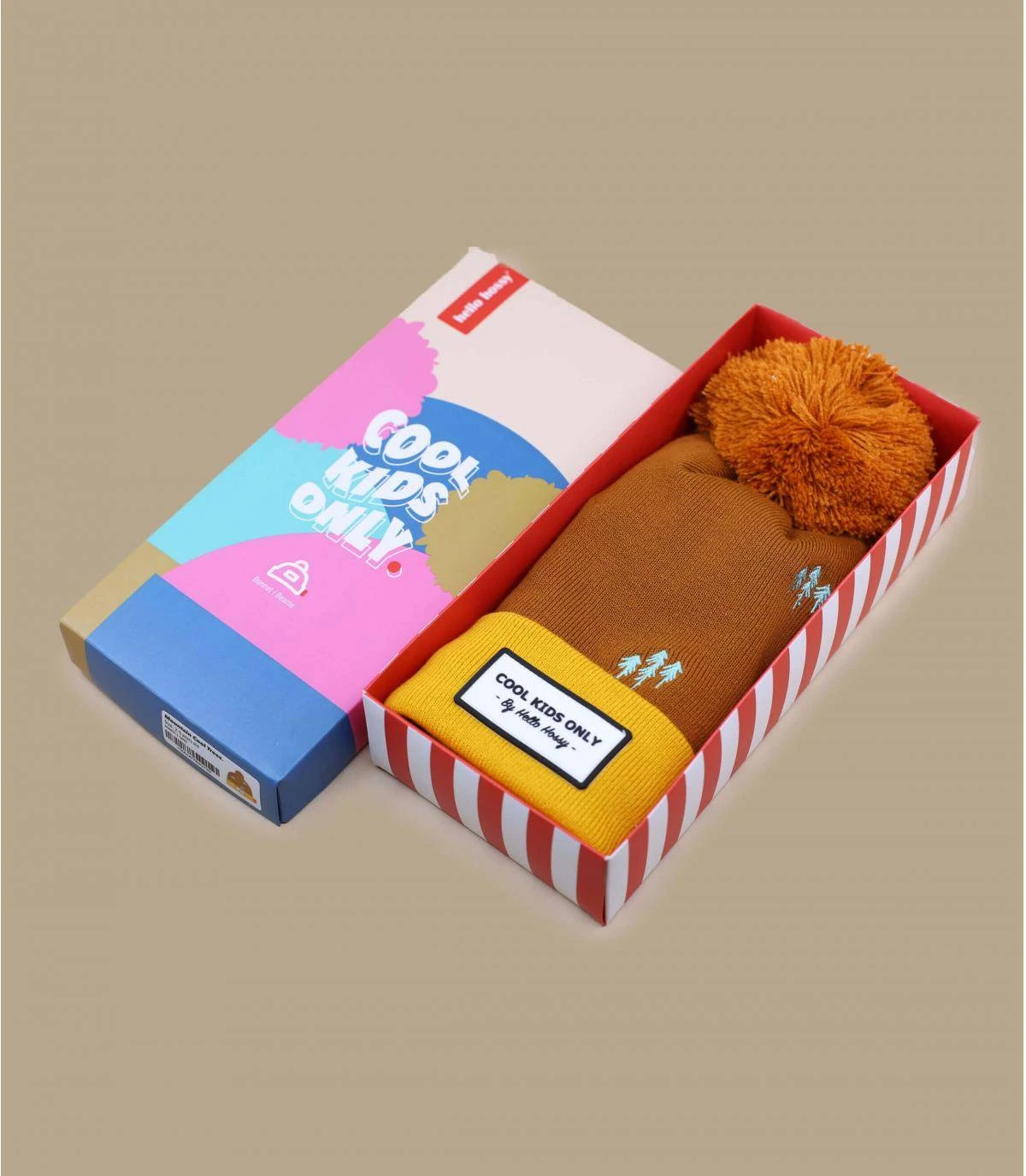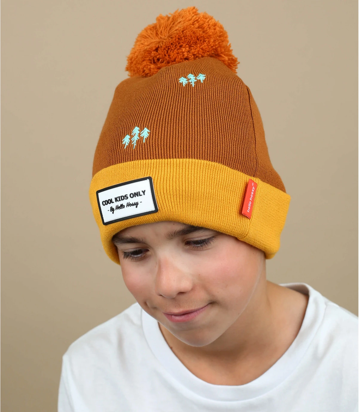 Composé de coton bio mélangé, ce charmant bonnet pour enfant marron à revers orangé est brodé de sapins pour un esprit très nature !