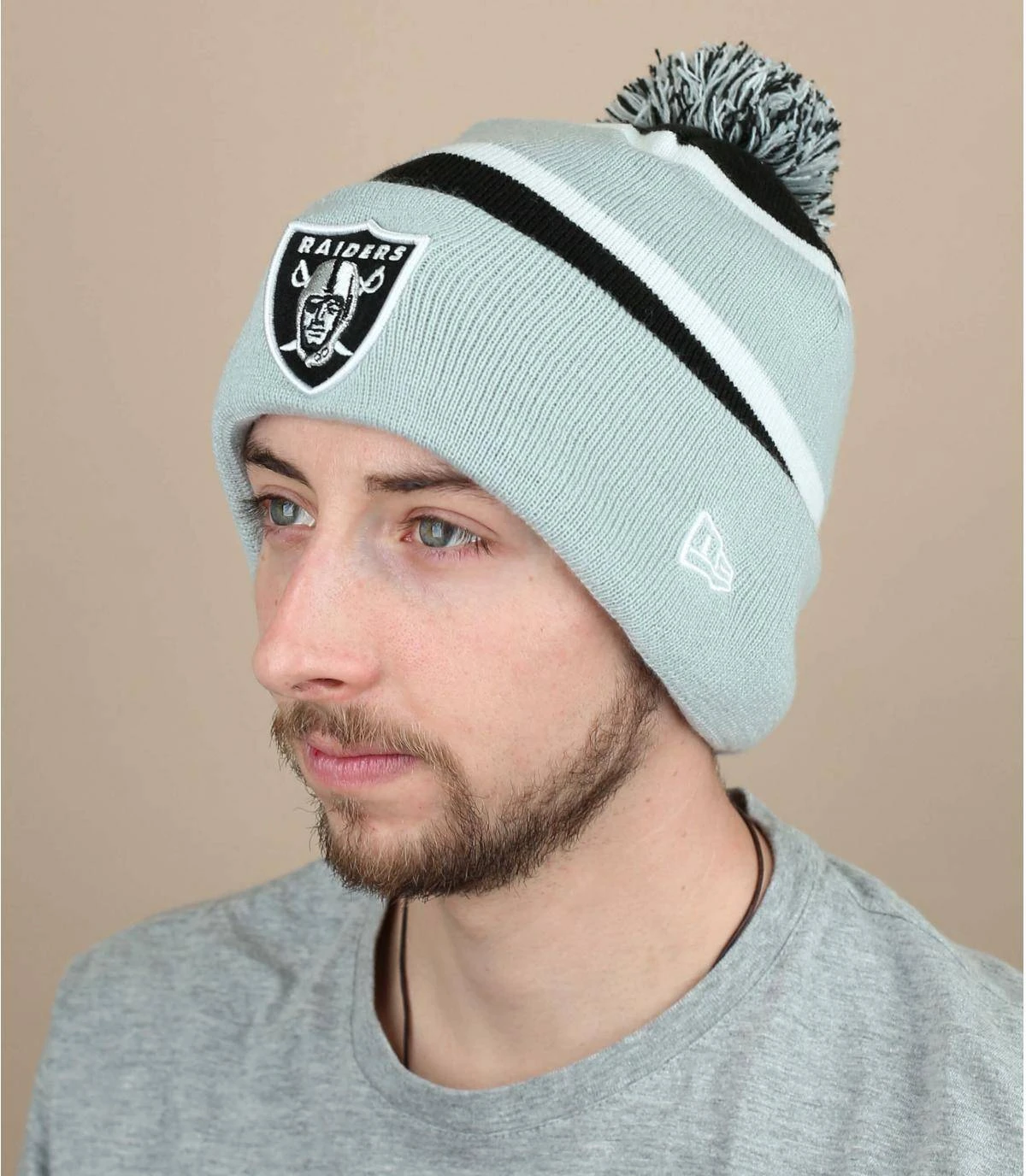 Vive l’hiver, c’est l’occasion de porter ce superbe bonnet gris à pompon, décoré sur le revers de l’emblème de l’équipe de football américain des Las Vegas Raiders. Il est doux et tient bien en place.