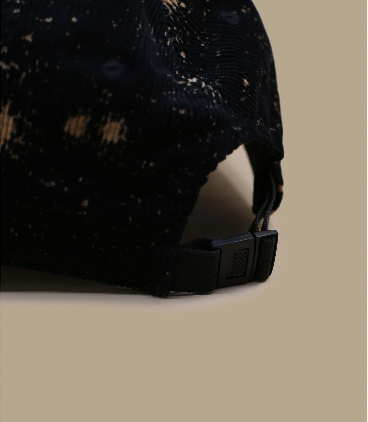 Cette magnifique casquette déstructurée New Era est composée de velours de coton stretch, relevée d’un original motif noir et beige comme délavé à l’acide.
