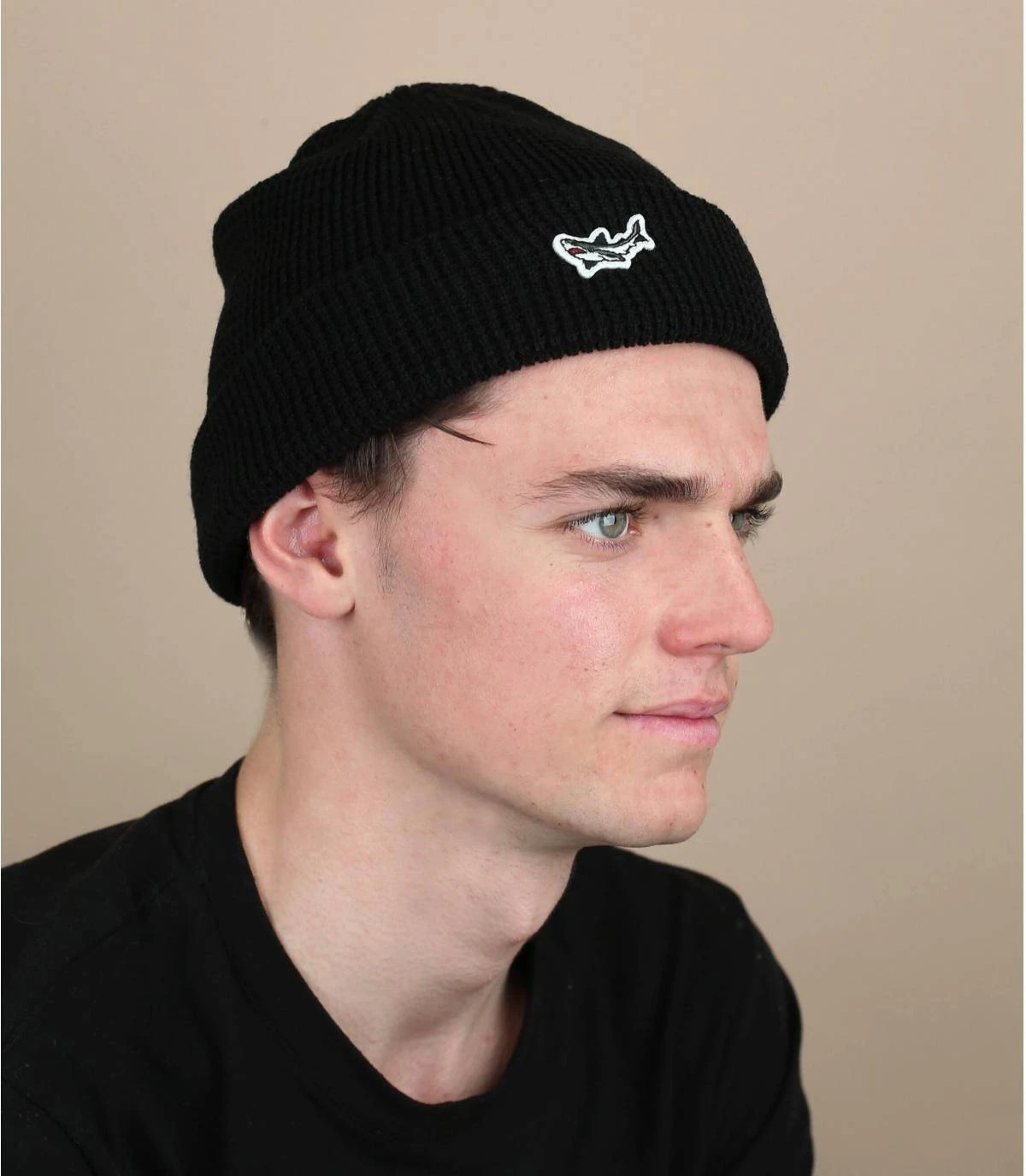 Ce bonnet noir de la marque Dark Seas se distingue par son tricot très doux en maille gaufrée et son revers qui le maintient bien en place sur votre tête malgré le vent. Il est relevé d’un original petit patch représentant un requin.