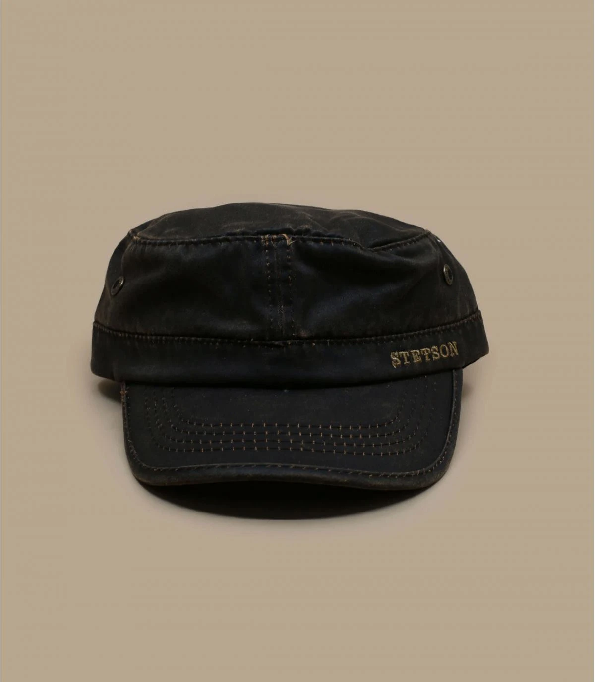Casquette army marron de la marque US Stetson. Œillets métal, broderie Stetson à l’avant.